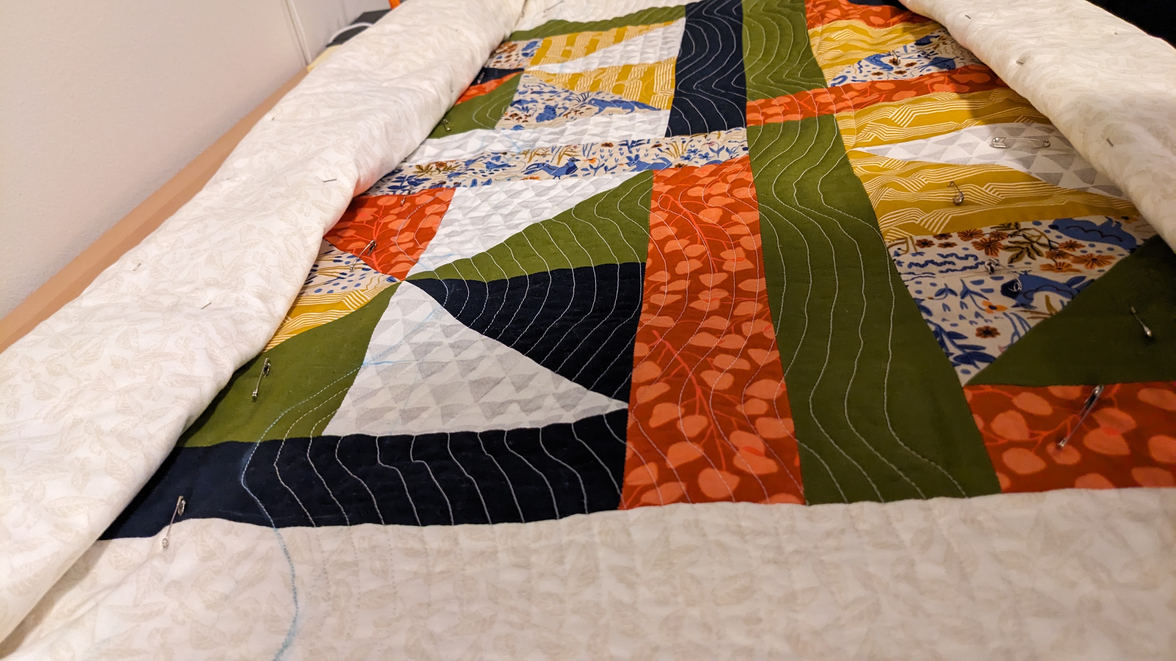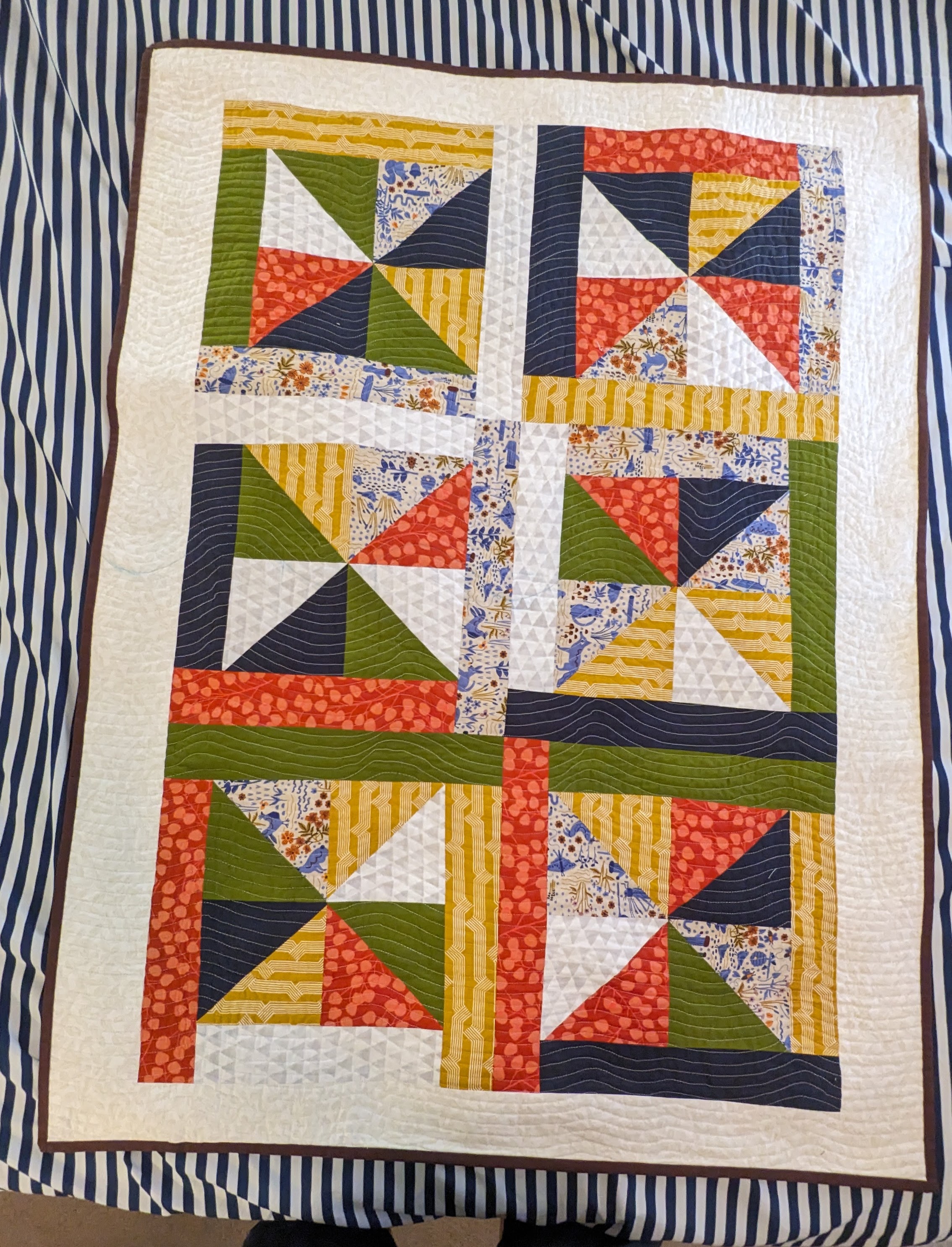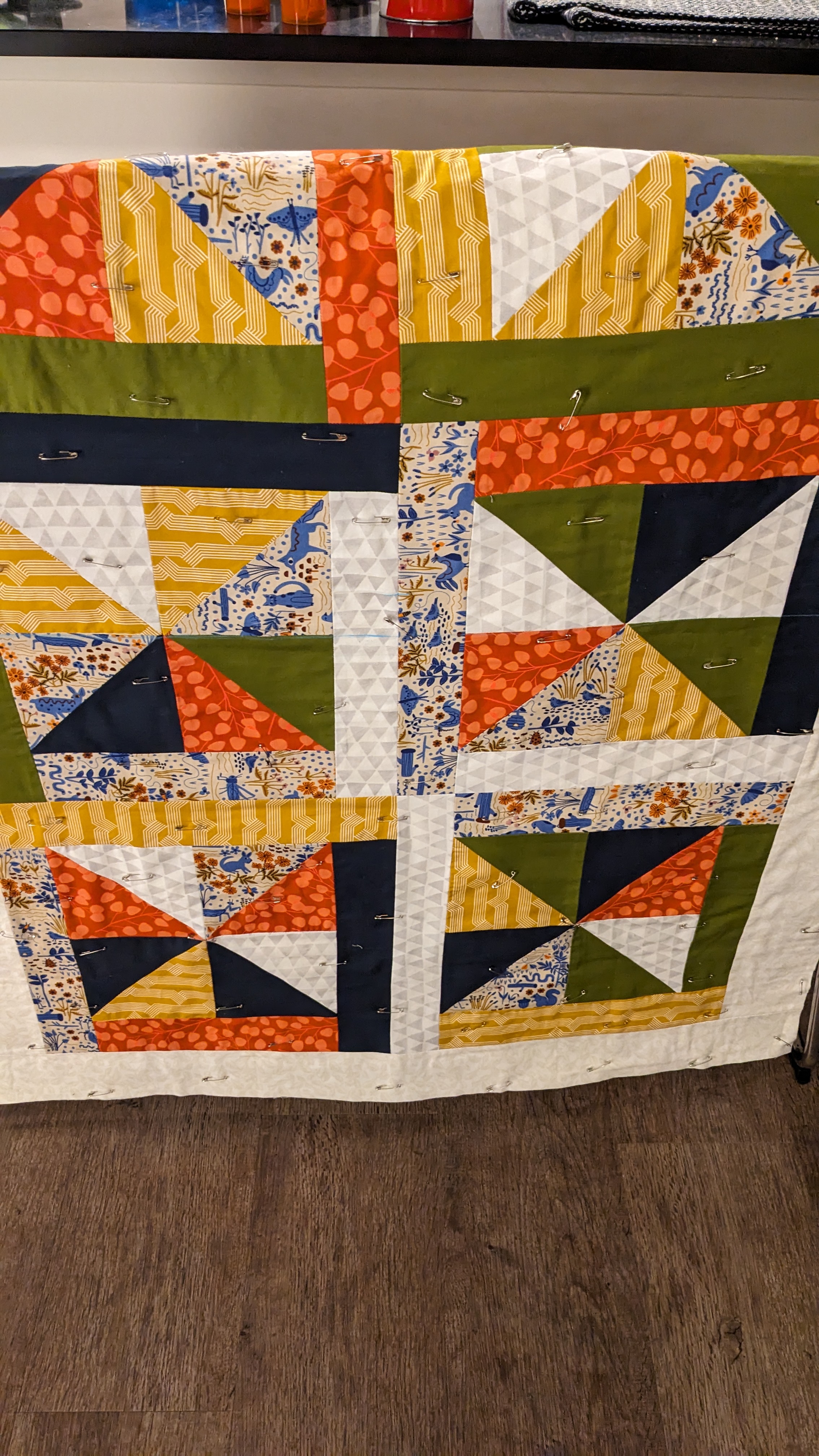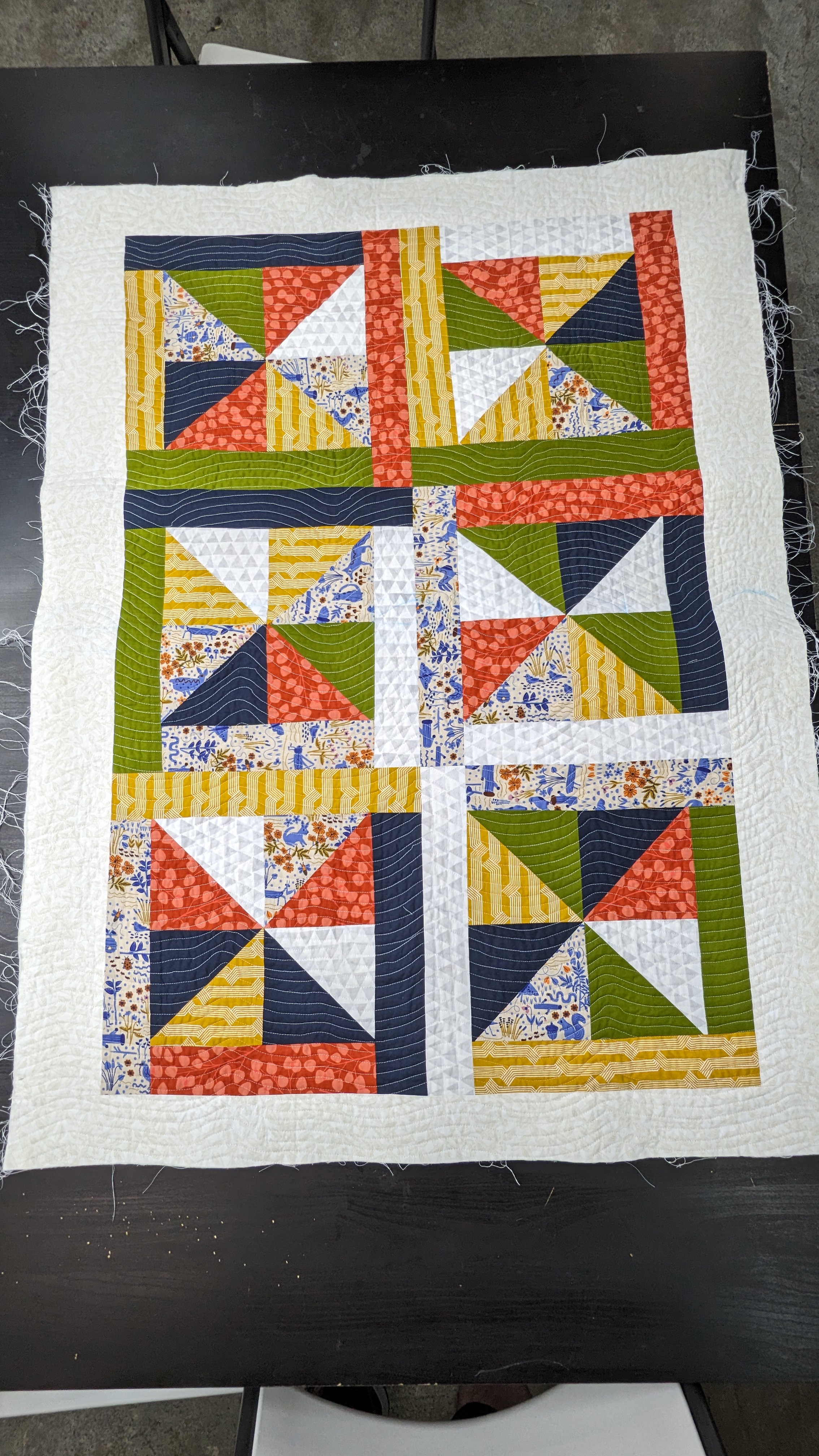 FabricsStep 1: Laying out borders around the pinwheel blocksFinishing the quilt top main patternAdding the border to fill out the quilt to a desired sizeMaking sure all of the seams sit flat and uniformAssembling the quilt sandwich (top, batting, and backing)Heavily pinning the quilt sandwich togetherStarting the quilting from an initial guidelineChecking the back after some quiltingMaking progress, one line at a timeMore back checksQuilting all finished!Binding attached to one side of the quiltClose up of binding workBinding corners are good, but not perfectHand-sewn binding completedBinding looks clean from the back, tooMore binding close upsAfter a wash, the quilt has some new textureSome binding sections need to be redone after the washMuch betterAll ready to be gifted to a special person