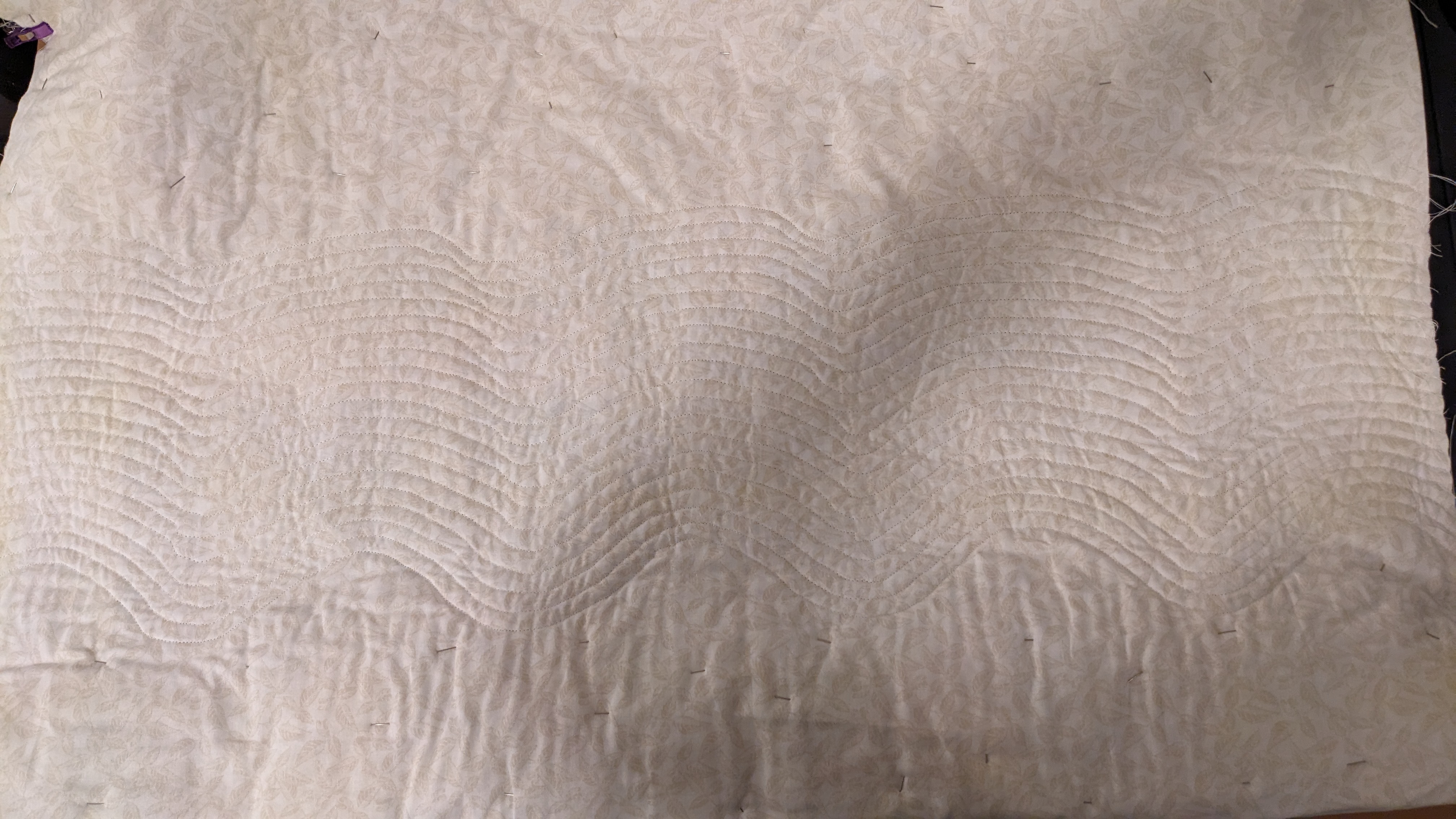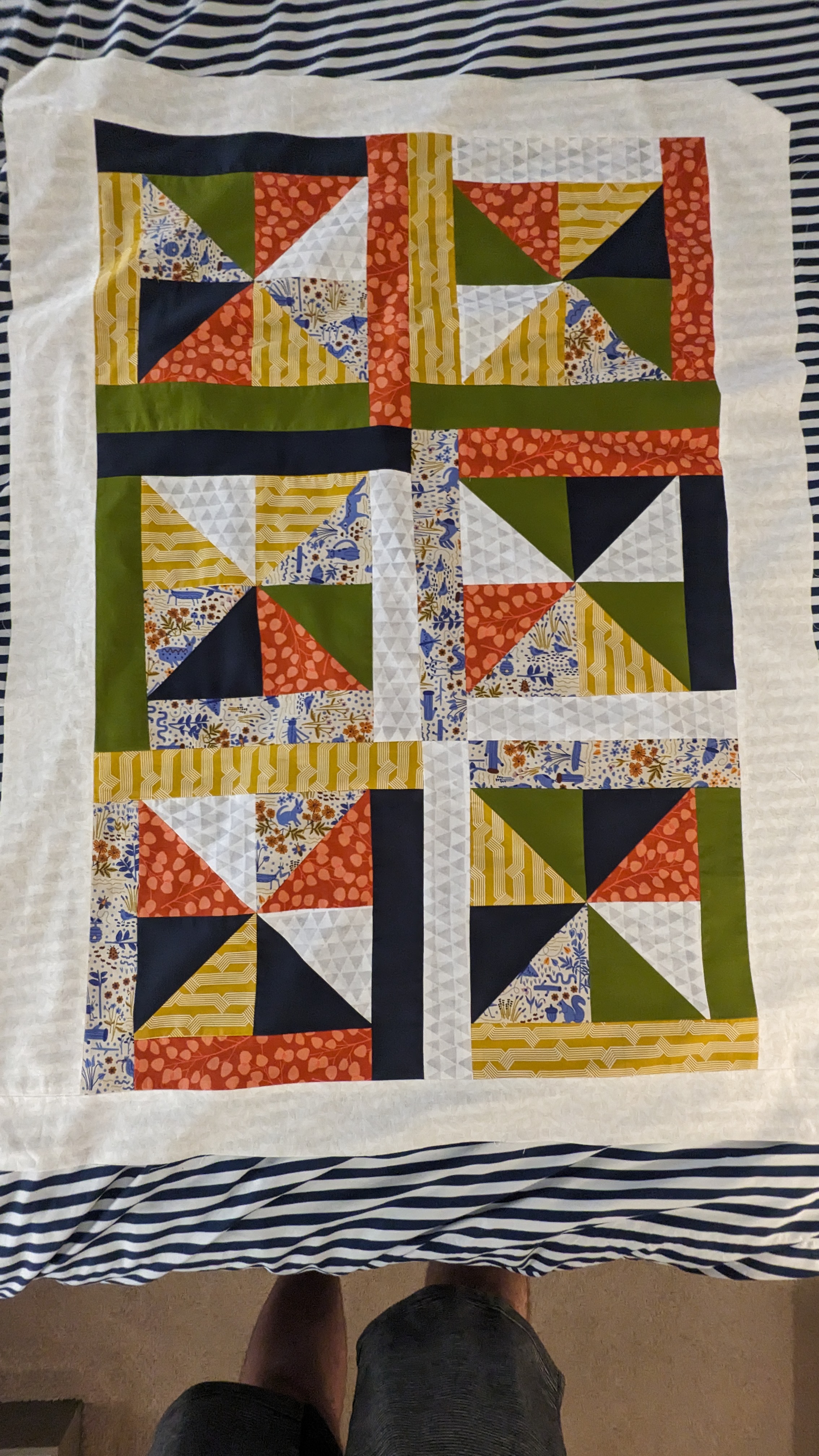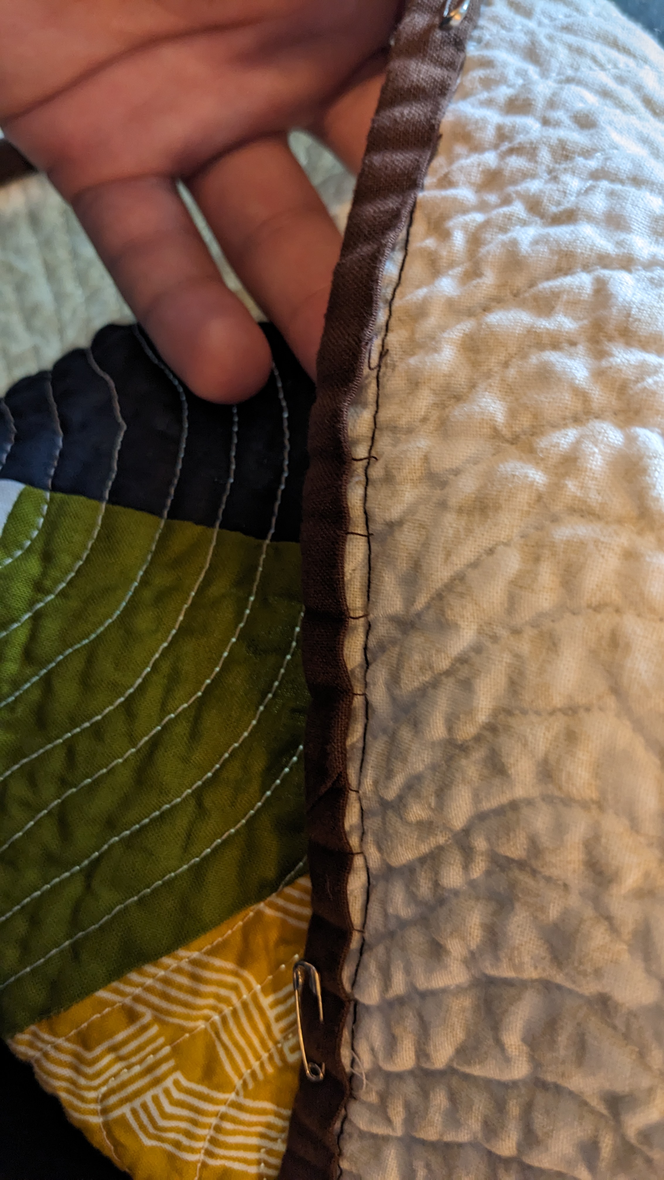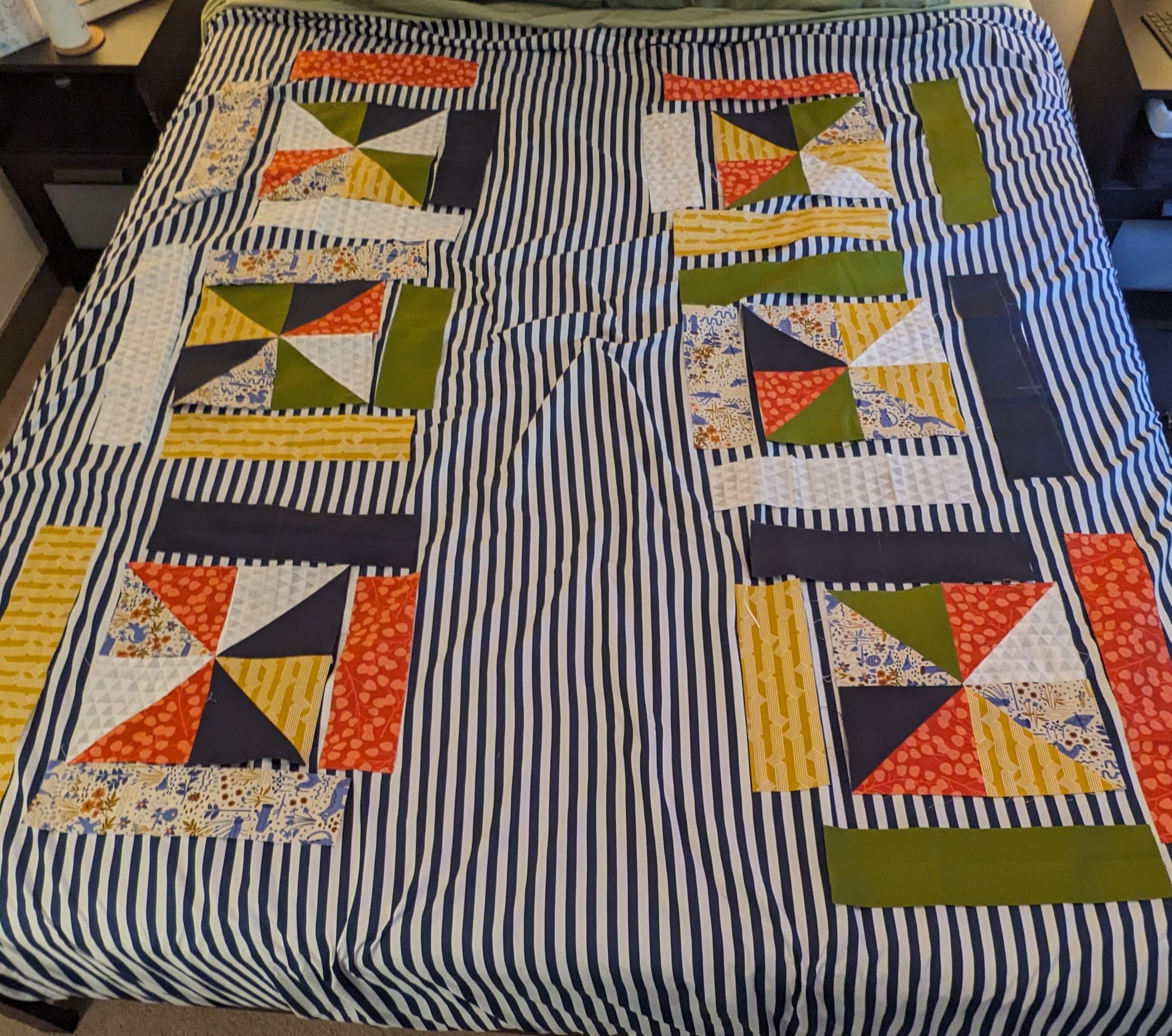 FabricsStep 1: Laying out borders around the pinwheel blocksFinishing the quilt top main patternAdding the border to fill out the quilt to a desired sizeMaking sure all of the seams sit flat and uniformAssembling the quilt sandwich (top, batting, and backing)Heavily pinning the quilt sandwich togetherStarting the quilting from an initial guidelineChecking the back after some quiltingMaking progress, one line at a timeMore back checksQuilting all finished!Binding attached to one side of the quiltClose up of binding workBinding corners are good, but not perfectHand-sewn binding completedBinding looks clean from the back, tooMore binding close upsAfter a wash, the quilt has some new textureSome binding sections need to be redone after the washMuch betterAll ready to be gifted to a special person