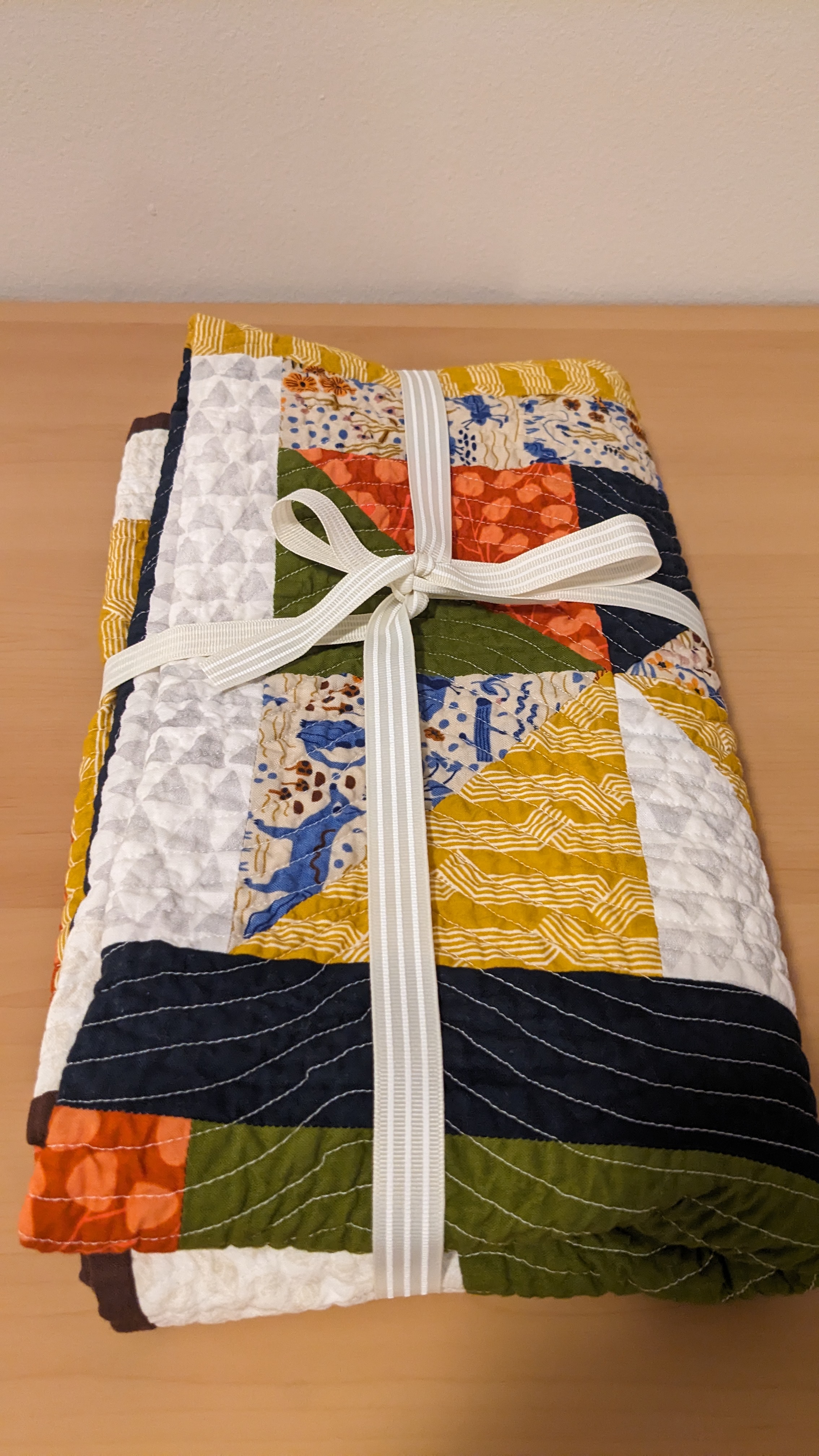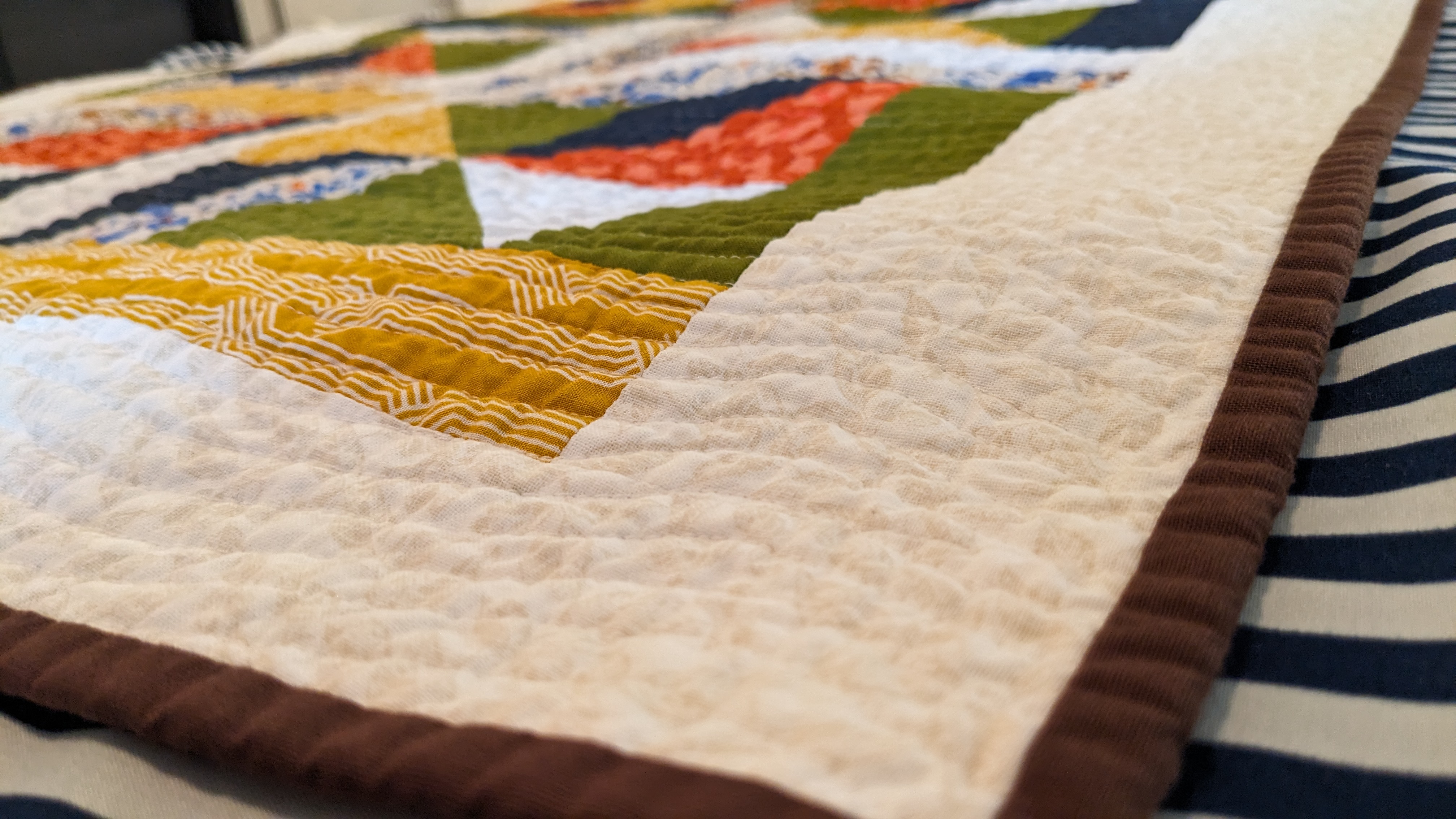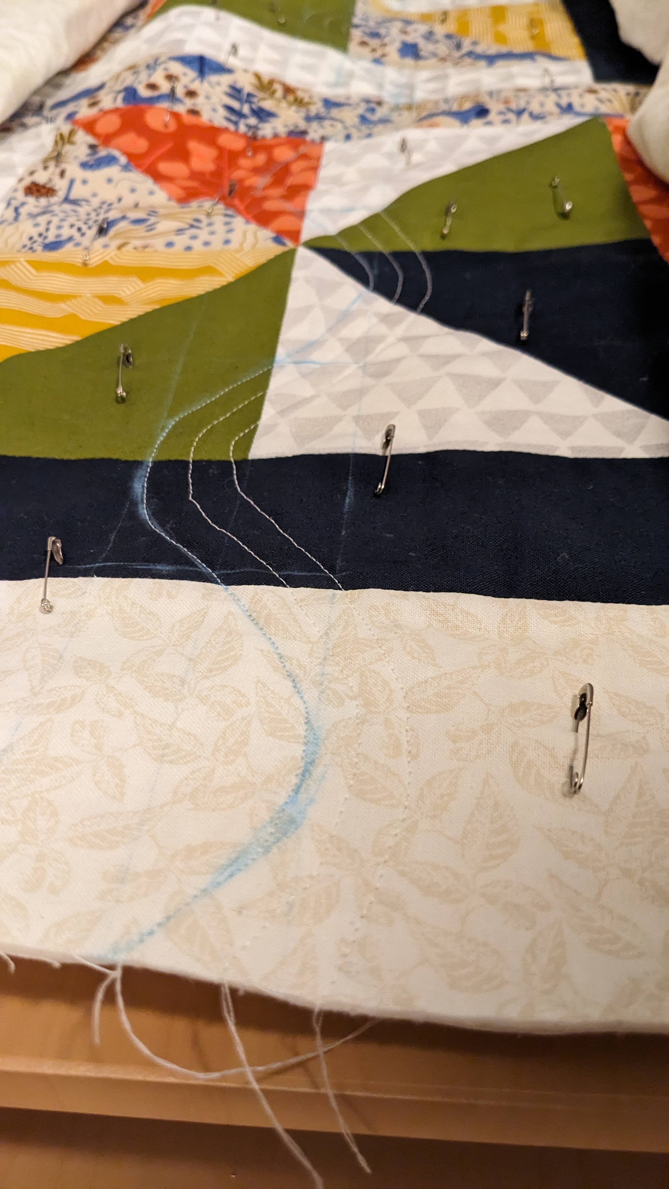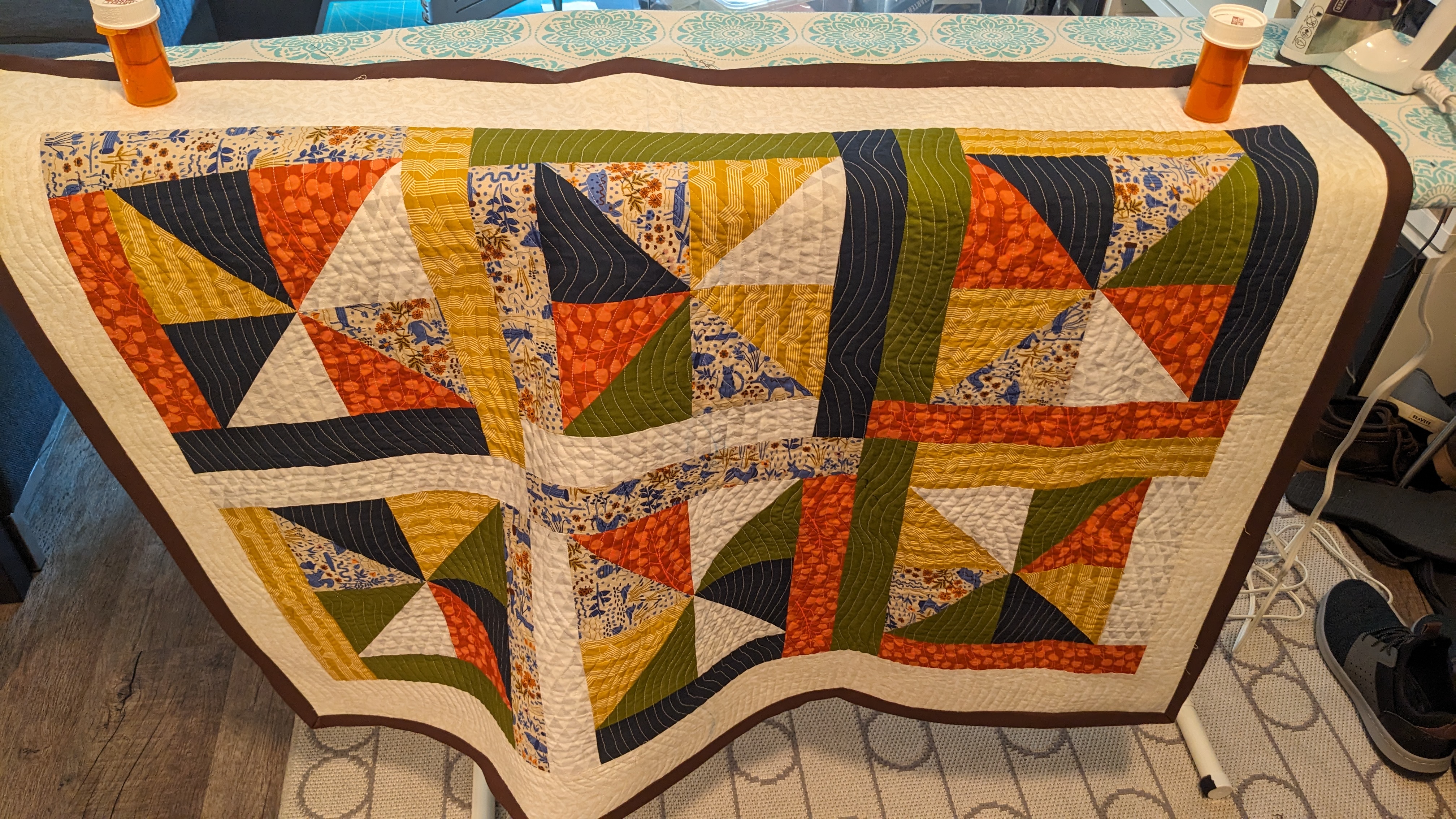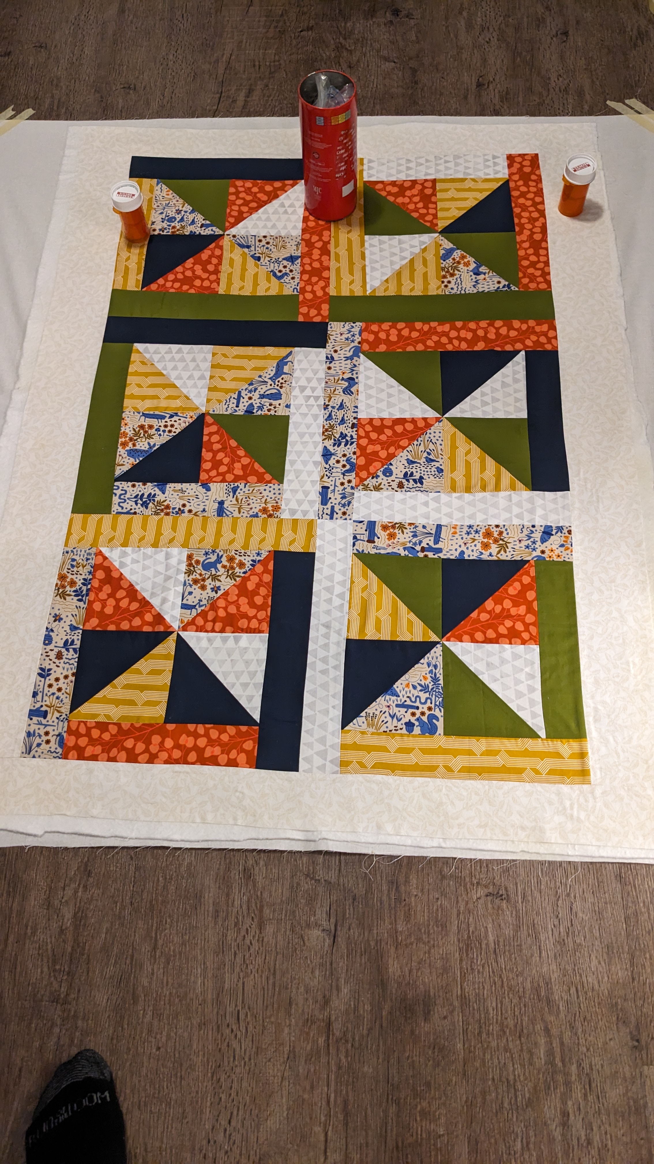 FabricsStep 1: Laying out borders around the pinwheel blocksFinishing the quilt top main patternAdding the border to fill out the quilt to a desired sizeMaking sure all of the seams sit flat and uniformAssembling the quilt sandwich (top, batting, and backing)Heavily pinning the quilt sandwich togetherStarting the quilting from an initial guidelineChecking the back after some quiltingMaking progress, one line at a timeMore back checksQuilting all finished!Binding attached to one side of the quiltClose up of binding workBinding corners are good, but not perfectHand-sewn binding completedBinding looks clean from the back, tooMore binding close upsAfter a wash, the quilt has some new textureSome binding sections need to be redone after the washMuch betterAll ready to be gifted to a special person
