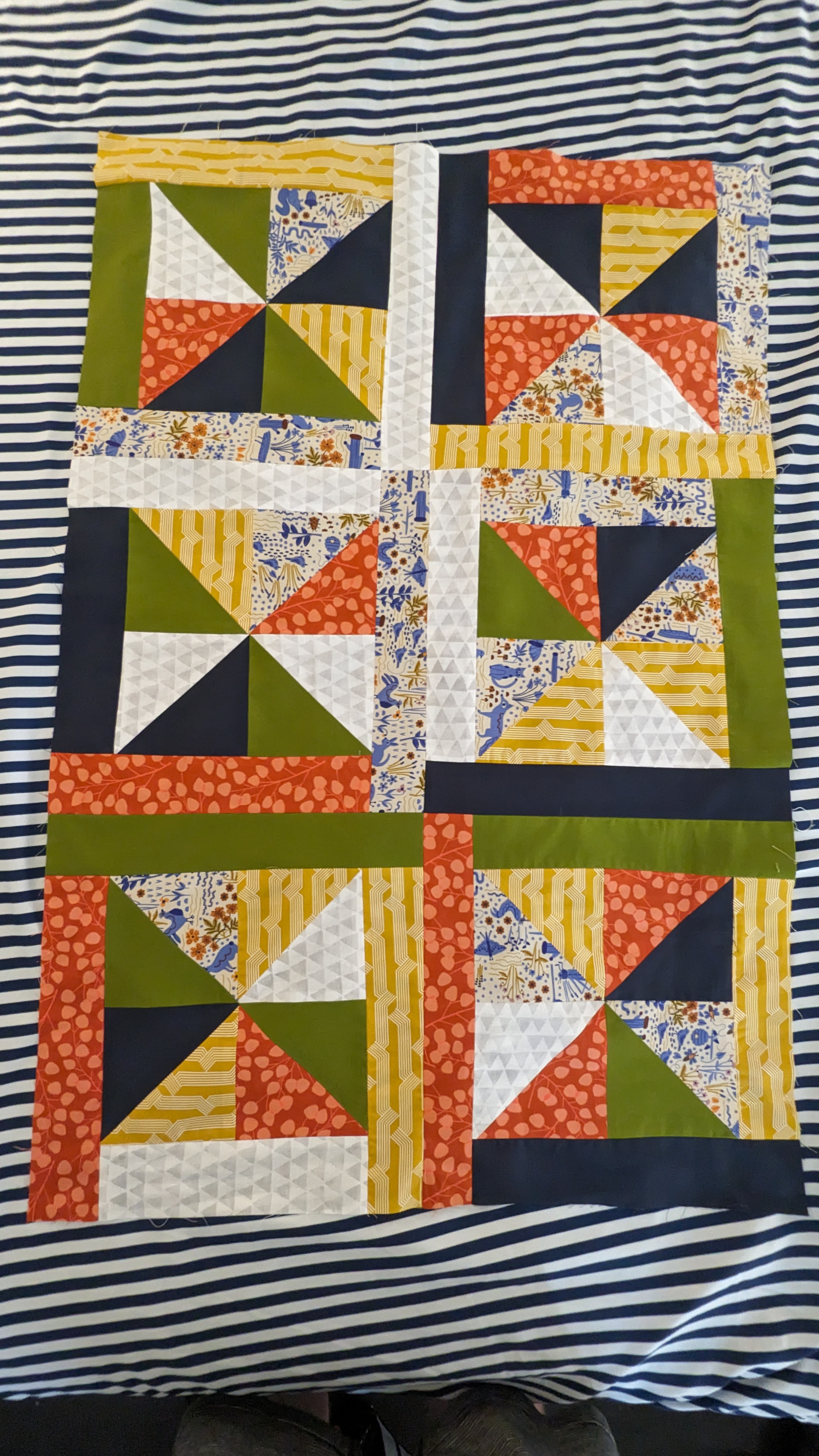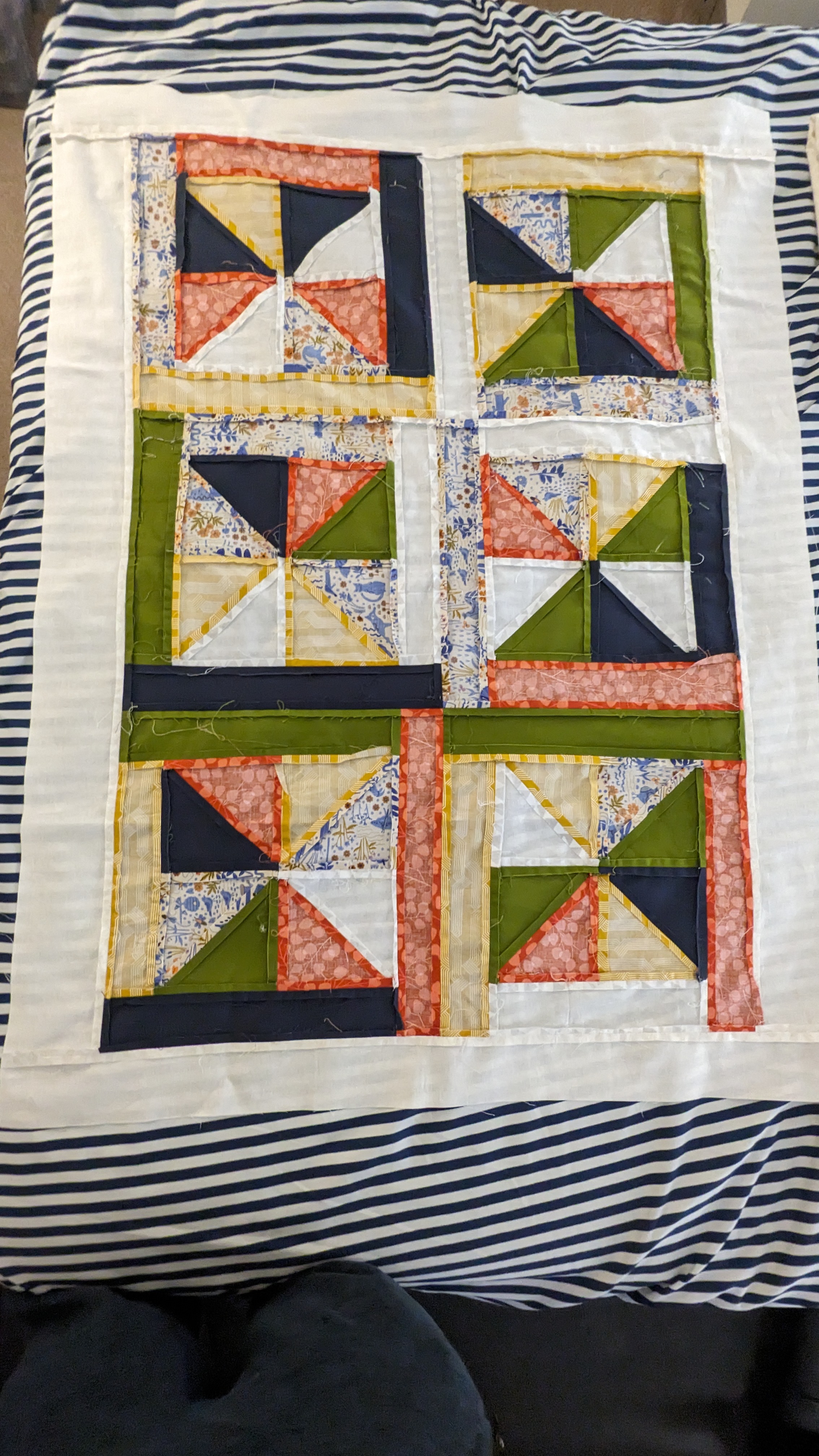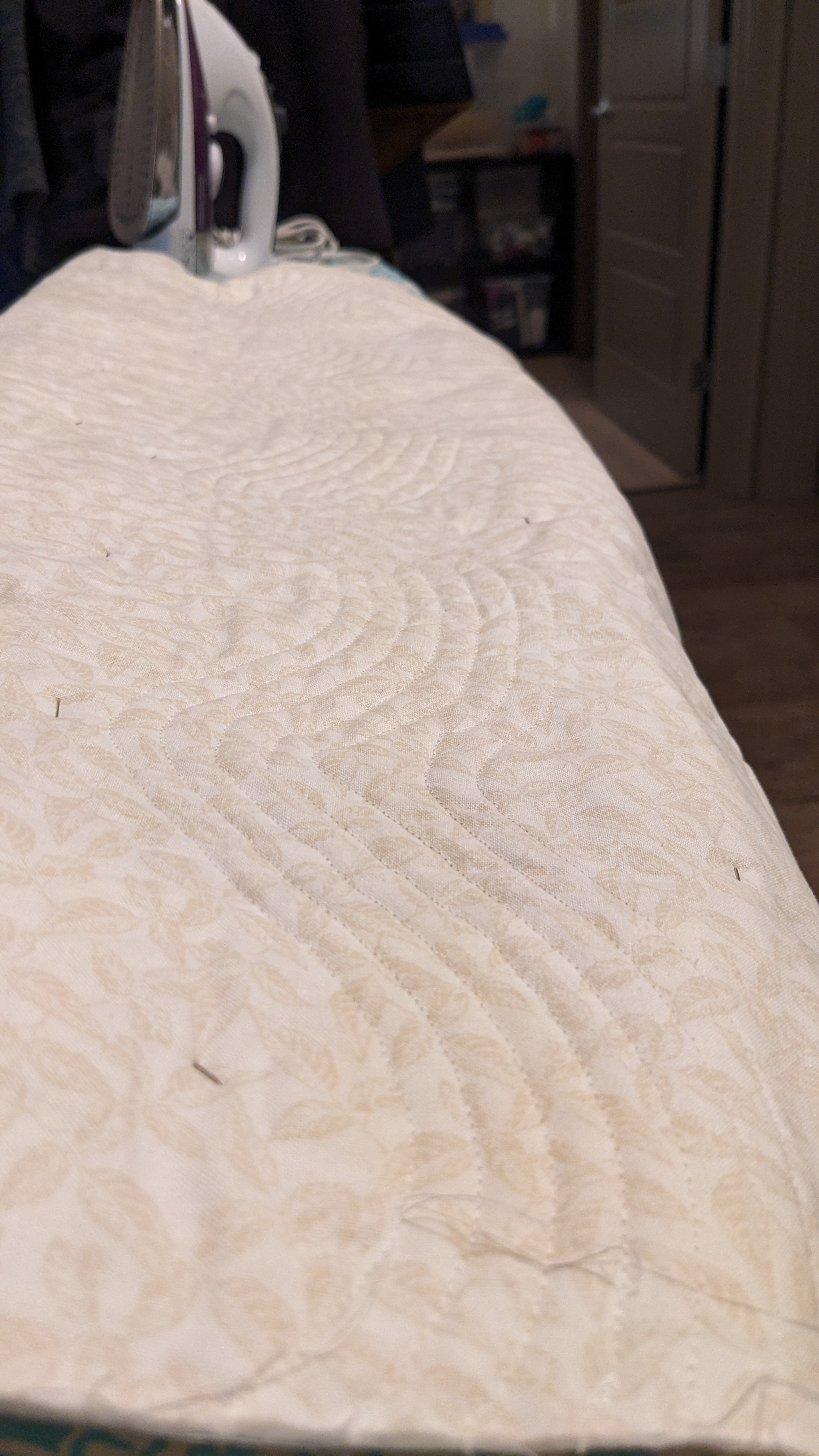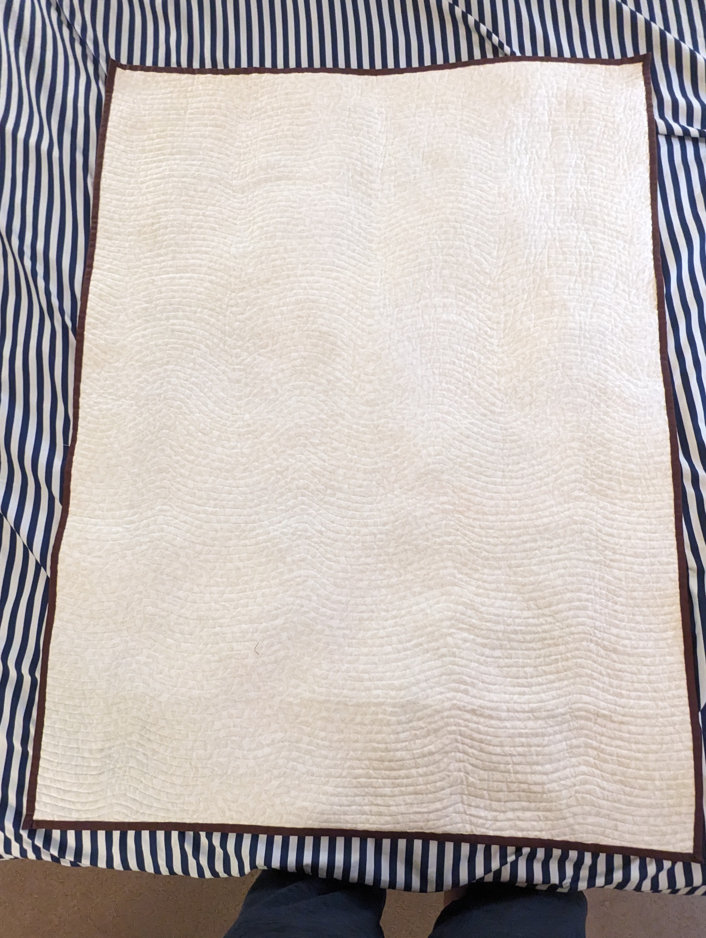 FabricsStep 1: Laying out borders around the pinwheel blocksFinishing the quilt top main patternAdding the border to fill out the quilt to a desired sizeMaking sure all of the seams sit flat and uniformAssembling the quilt sandwich (top, batting, and backing)Heavily pinning the quilt sandwich togetherStarting the quilting from an initial guidelineChecking the back after some quiltingMaking progress, one line at a timeMore back checksQuilting all finished!Binding attached to one side of the quiltClose up of binding workBinding corners are good, but not perfectHand-sewn binding completedBinding looks clean from the back, tooMore binding close upsAfter a wash, the quilt has some new textureSome binding sections need to be redone after the washMuch betterAll ready to be gifted to a special person