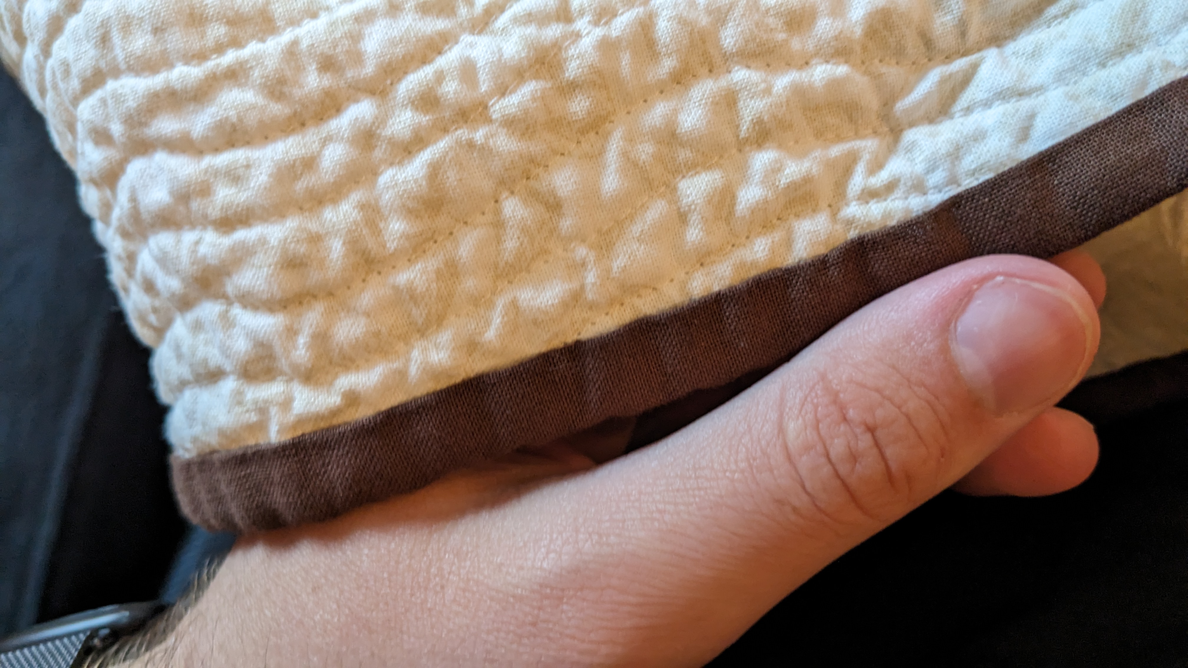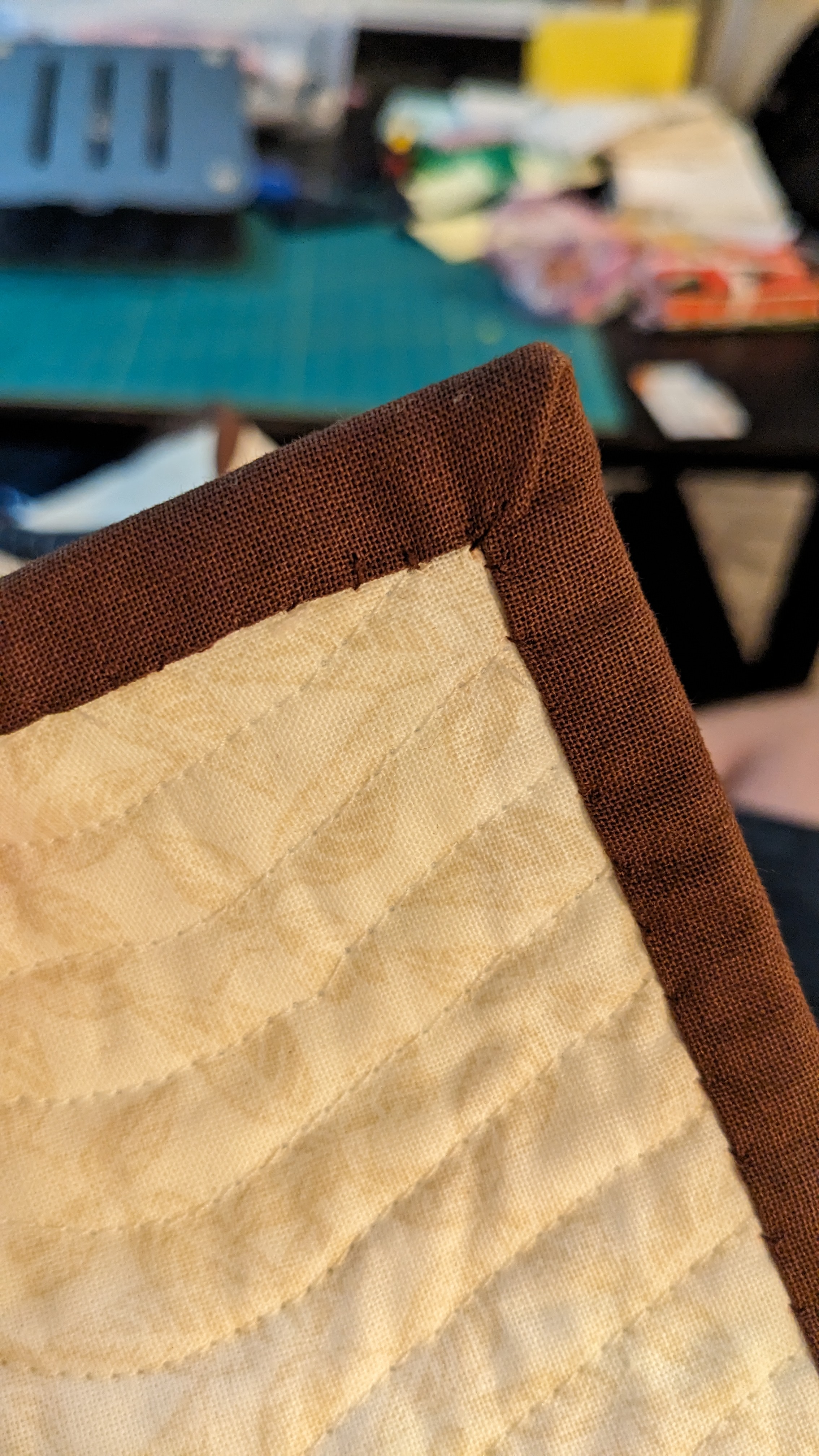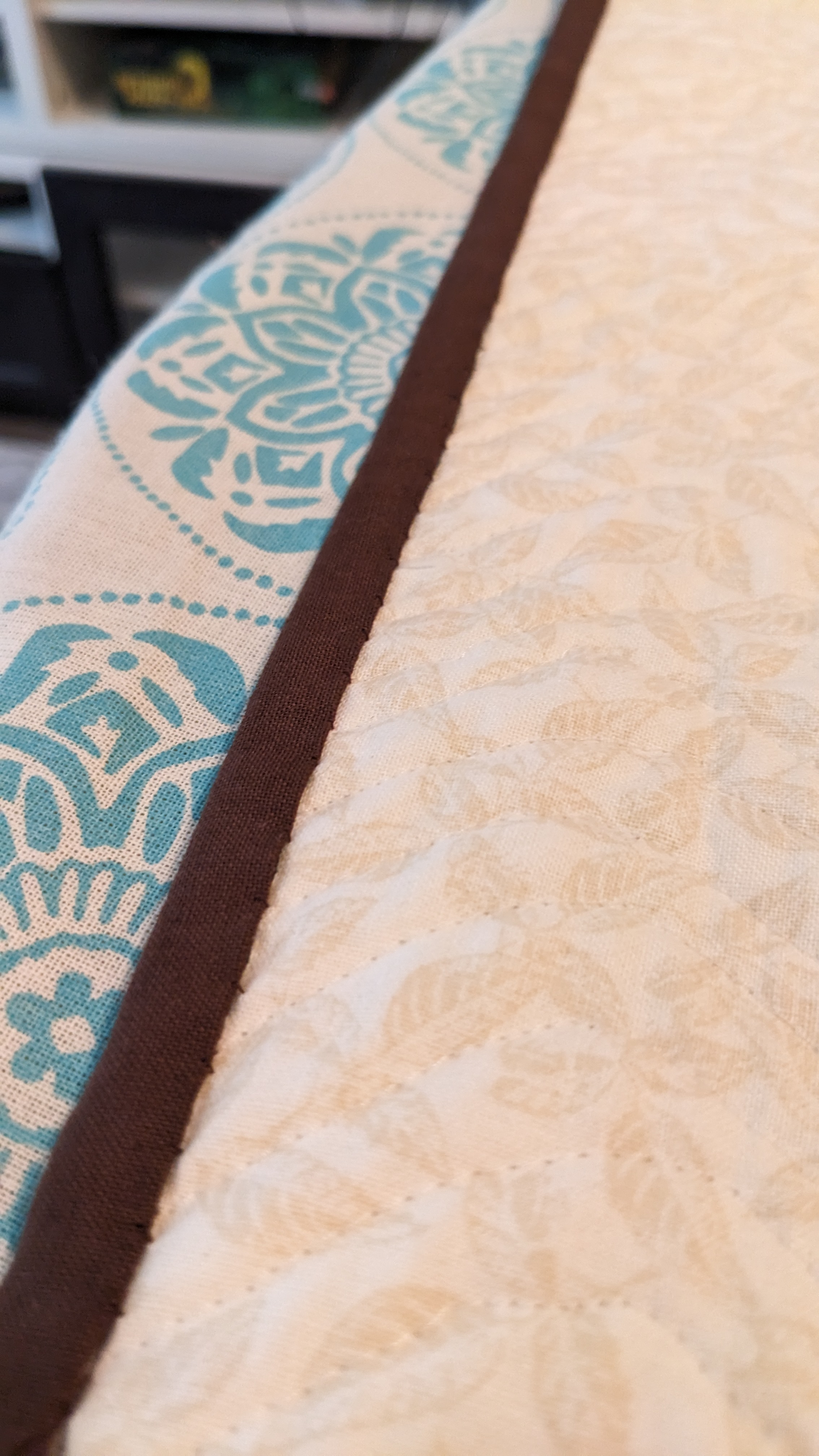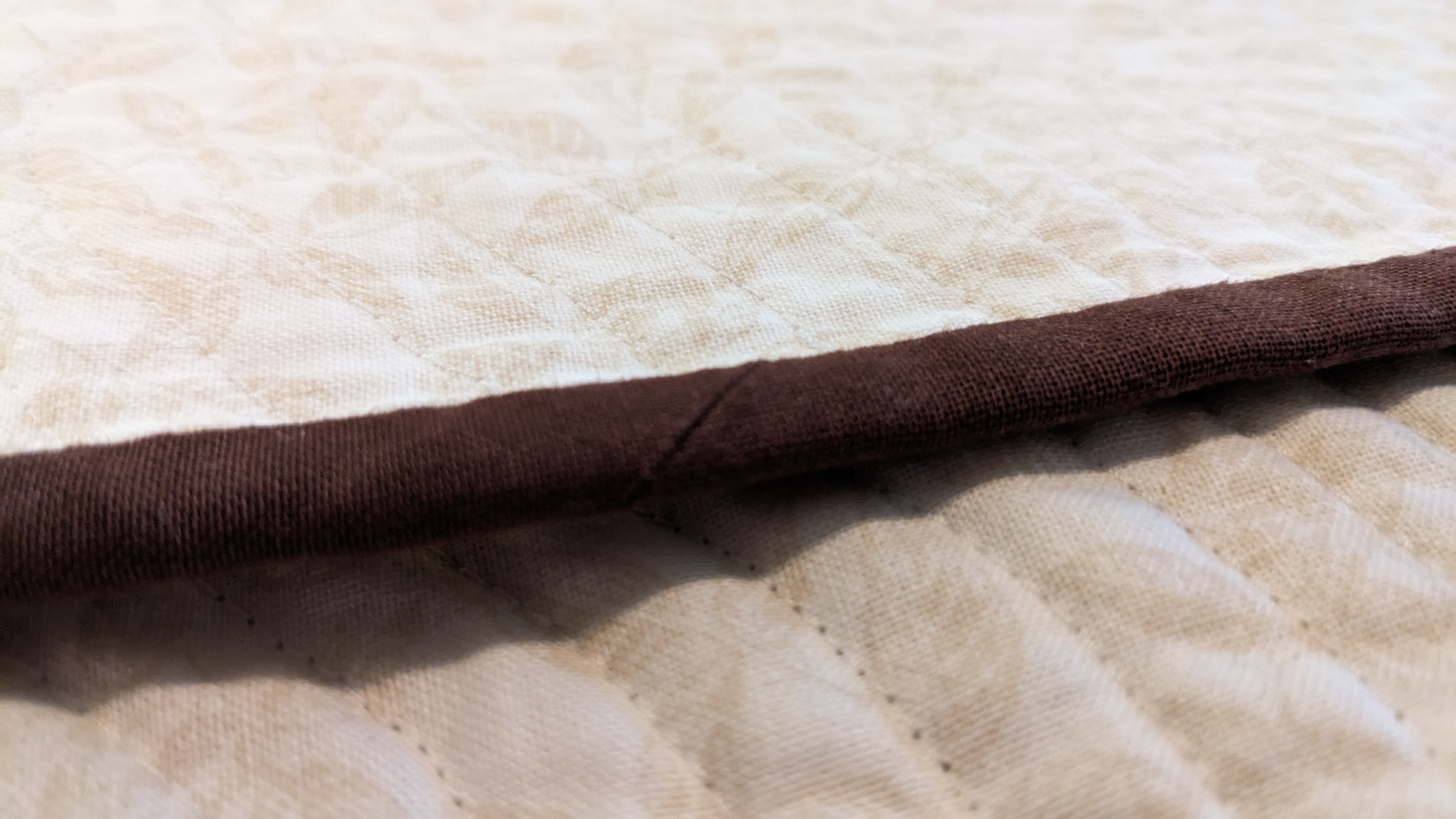 FabricsStep 1: Laying out borders around the pinwheel blocksFinishing the quilt top main patternAdding the border to fill out the quilt to a desired sizeMaking sure all of the seams sit flat and uniformAssembling the quilt sandwich (top, batting, and backing)Heavily pinning the quilt sandwich togetherStarting the quilting from an initial guidelineChecking the back after some quiltingMaking progress, one line at a timeMore back checksQuilting all finished!Binding attached to one side of the quiltClose up of binding workBinding corners are good, but not perfectHand-sewn binding completedBinding looks clean from the back, tooMore binding close upsAfter a wash, the quilt has some new textureSome binding sections need to be redone after the washMuch betterAll ready to be gifted to a special person